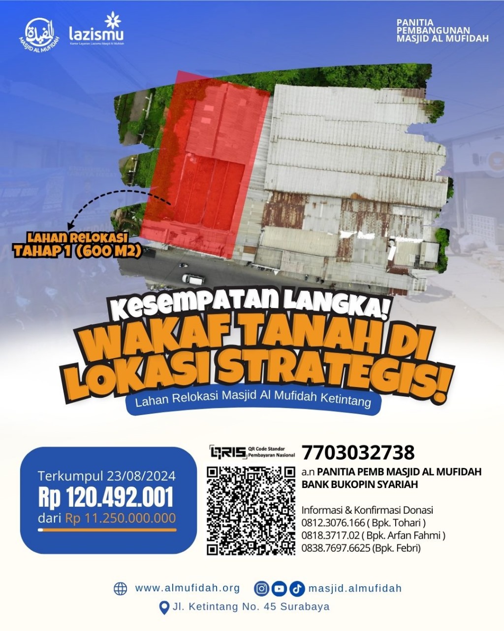 “Saat ini dalam proses pembelian lahan dengan luas 600 M2, yang berada tepat di depan Masjid Al-Mufidah dan Sekolah Karakter SD Muhammadiyah 24 Surabaya.” Tuturnya.