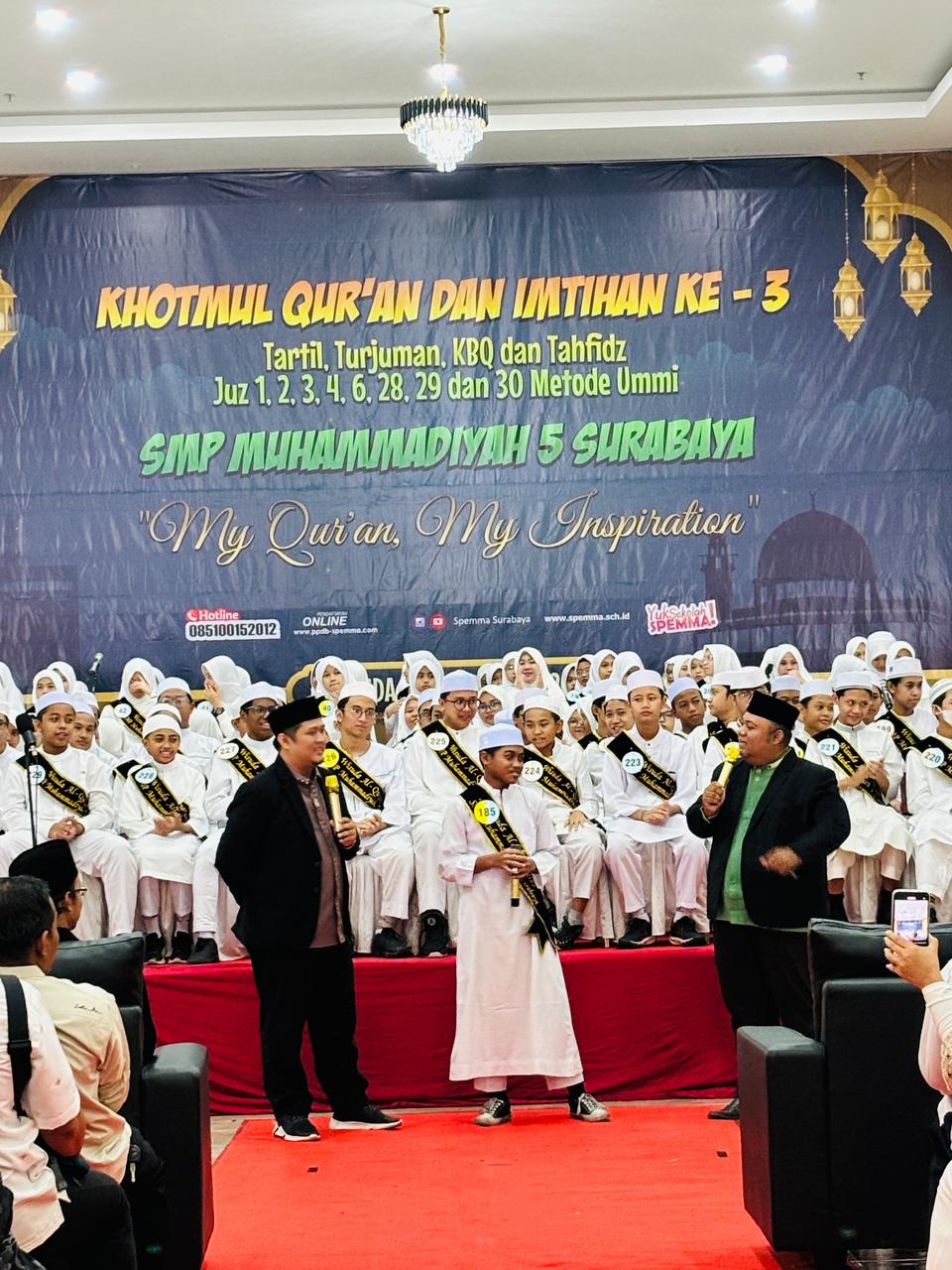 “Banyak pengalaman yang bisa saya ambil selama Sekolah di SMP Muhammadiyah 5 Surabaya. Tahun ini adalah khotmil ketiga, saya di SMP Muhammadiyah 5, dari yang awalnya tidak bisa mengaji menjadi bisa mengaji dan bisa melaksanakan Khotmil Qur’an di Spemma Surabaya.” Ujarnya.