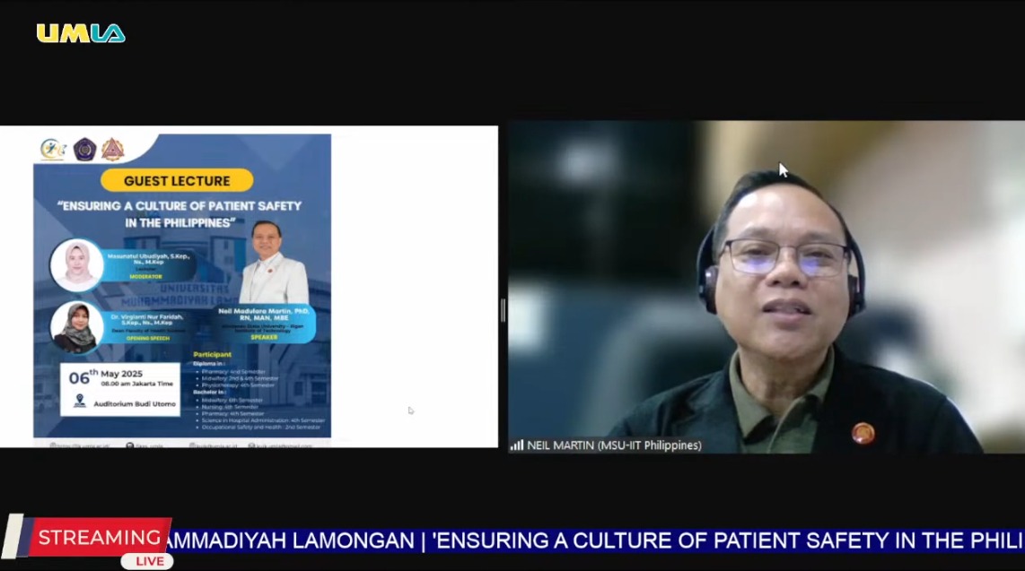Dalam Guest Lecture kali ini menghadirkan Dr. Neil M Martin, Ph.D., RN., MAN MBE., pakar keperawatan dari Mindanao State University-Iligan Institute of Technology, Philippines. Dalam pemaparannya, Dr. Martin menekankan pentingnya membangun dan menjaga budaya keselamatan pasien sebagai elemen krusial dalam penyelenggaraan pelayanan kesehatan. Ia membagikan pengalaman dan praktik terbaik yang diterapkan di Filipina, memberikan perspektif global yang sangat bermanfaat bagi para peserta.