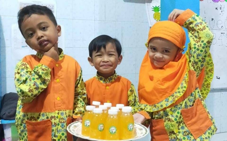 Dengan antusias dan tertib, para balita itu berbaris untuk memasukkan butiran buah jeruk ke dalam juicer. Mata mereka berbinar menyaksikan cairan jeruk segar berwarna kuning itu tercipta.