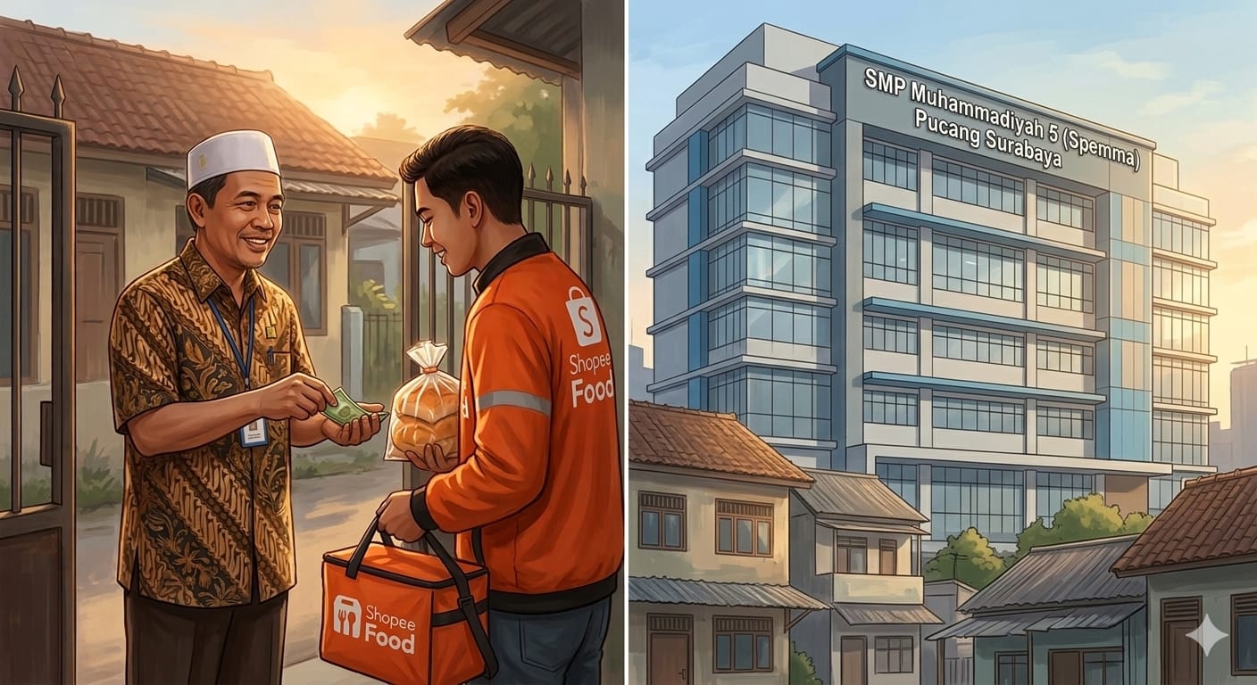 Sebuah kisah lucu dan inspiratif terjadi di SMP Muhammadiyah 5 (Spemma) Pucang Surabaya beberapa hari lalu. Seorang kurir Shopee food yang sedang mengantar pesanan roti, kebingungan mencari alamat tujuan. Kebetulan, saya salah satu guru Ismuba sekaligus Kepala Urusan (Kaur) Human Resources Development (HRD) Ustadz M. Arif Faizin, S.Ag., lewat di dekatnya dan menawarkan bantuan.